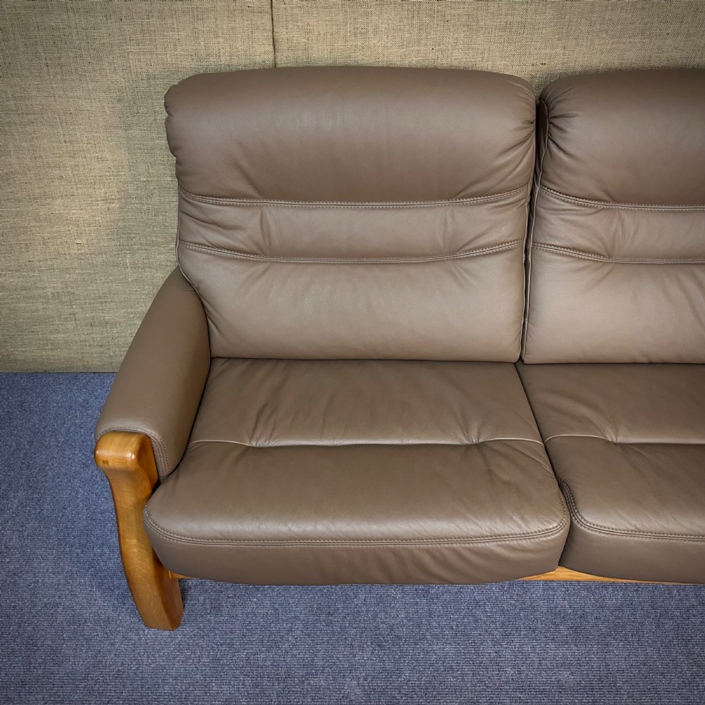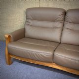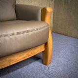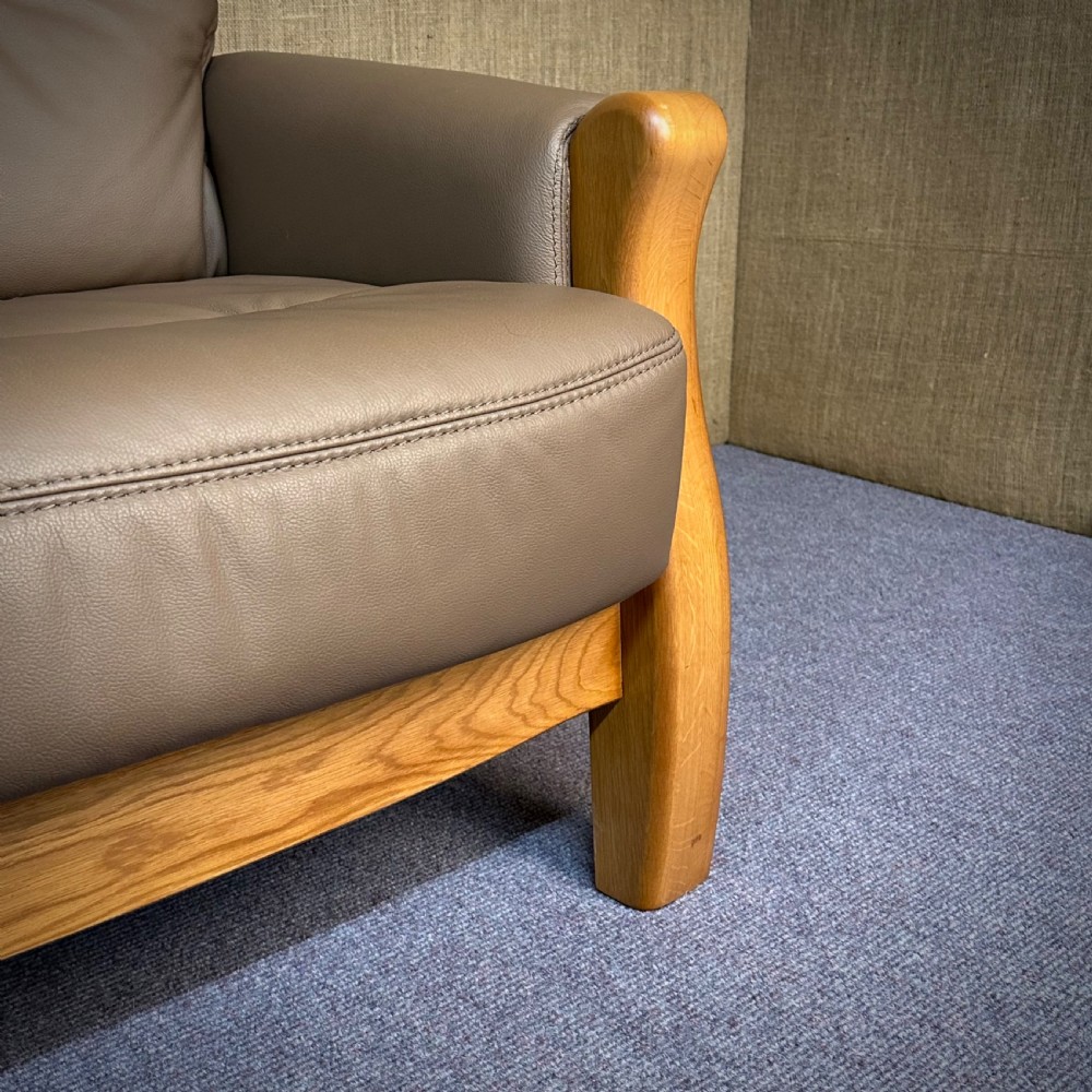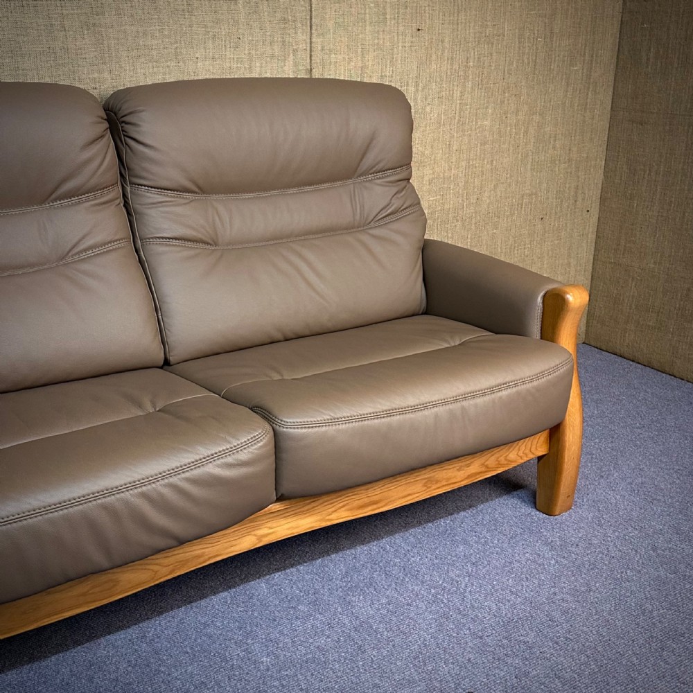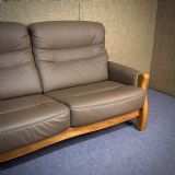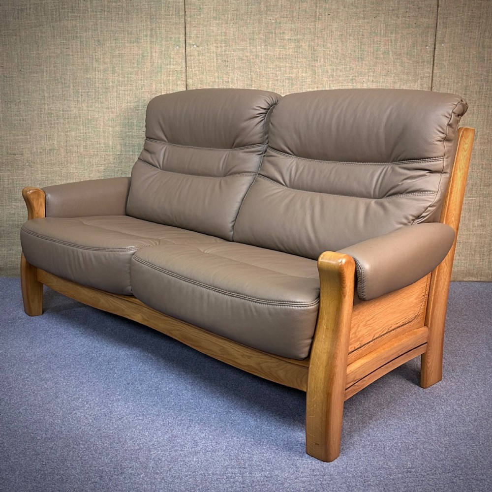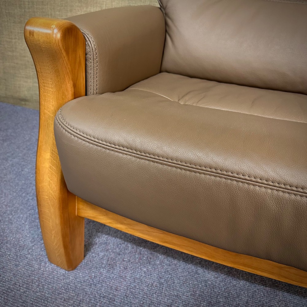 Upholstered in brown leather this sofa features a stylish exposed solid oak frame.