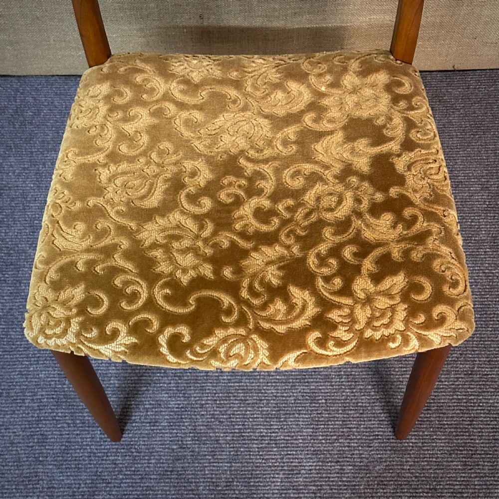 The chairs sit on slightly downward tapered legs. The seat pads are upholstered in a gold velour fabric.