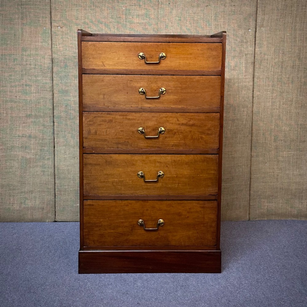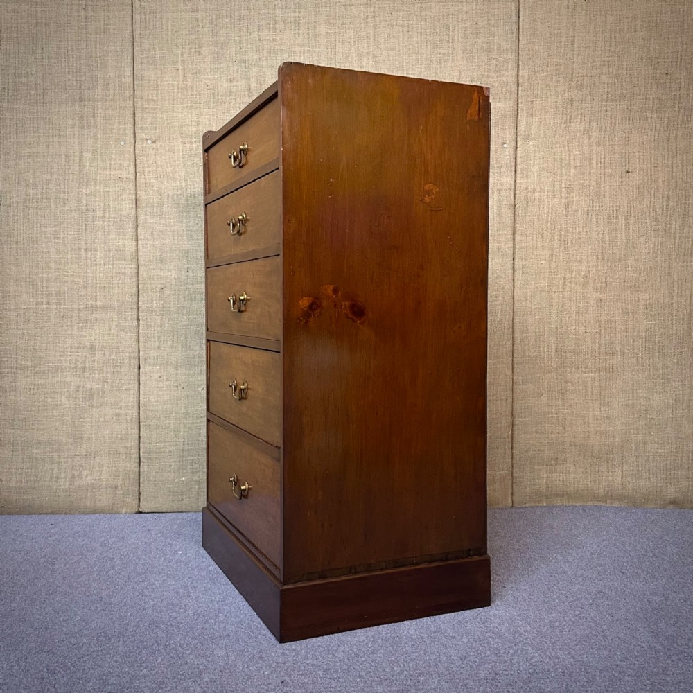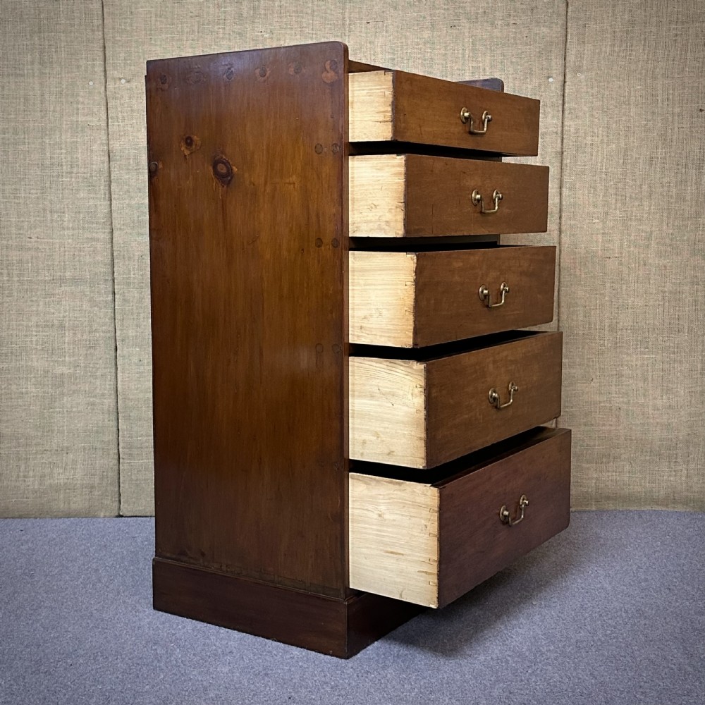 The chest sits on a plinth base and consists of five graduated drawers with drop handles.