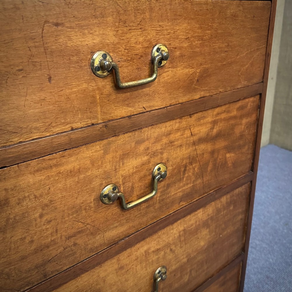 This lovely chest of drawers remains in good solid condition with minor surface markings commensurate with age and usage. There are some old worm holes to the bottom of the base at the rear. There is a later added hardboard backboard. There are a couple of small chips to some edges of the chest.