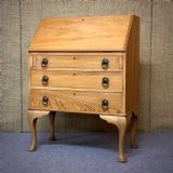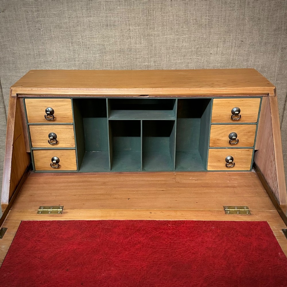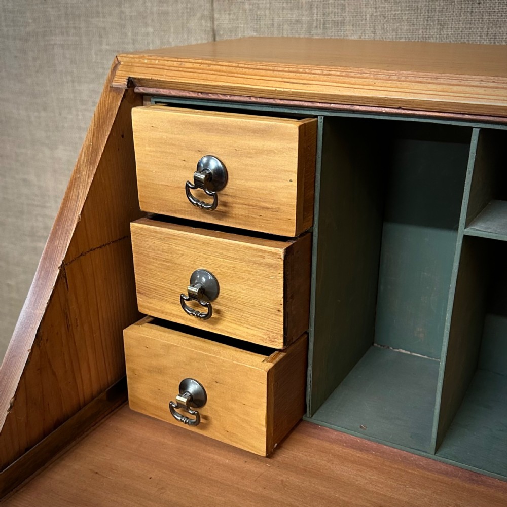 The drop flap lowers to reveal the fitted interior, which consists of various pigeon holes and a bank of three small drawers at each side. Below this there are three wide graduated drawers. The drawers are fitted with round drop handles.