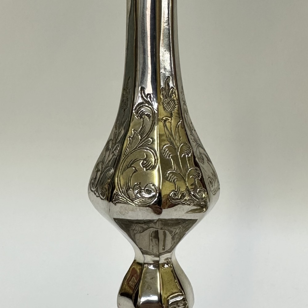 This lovely set has three graduated sizes and a lovely engraved pattern. Each candle stick is in one part.