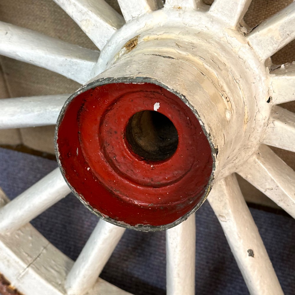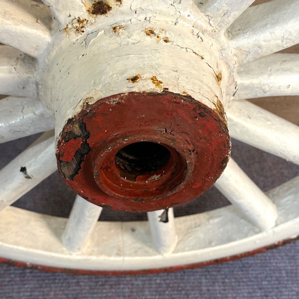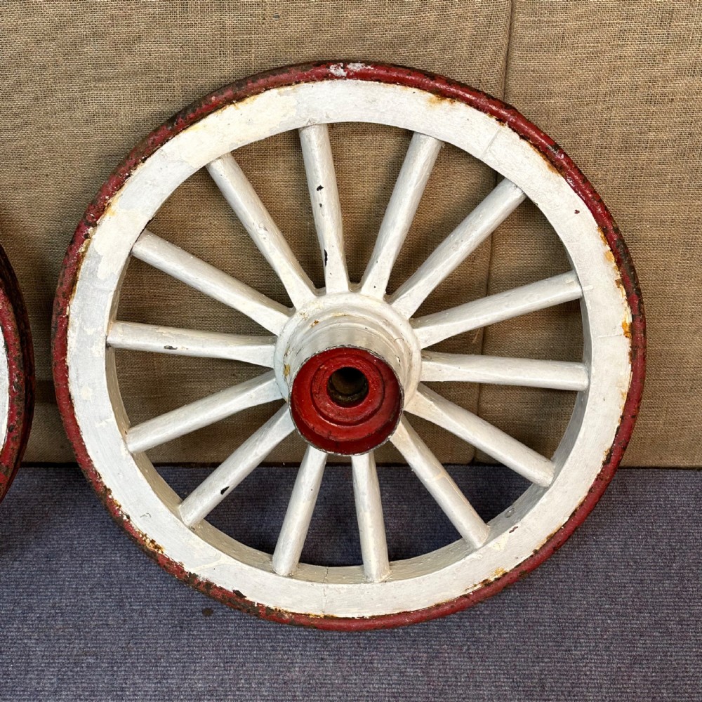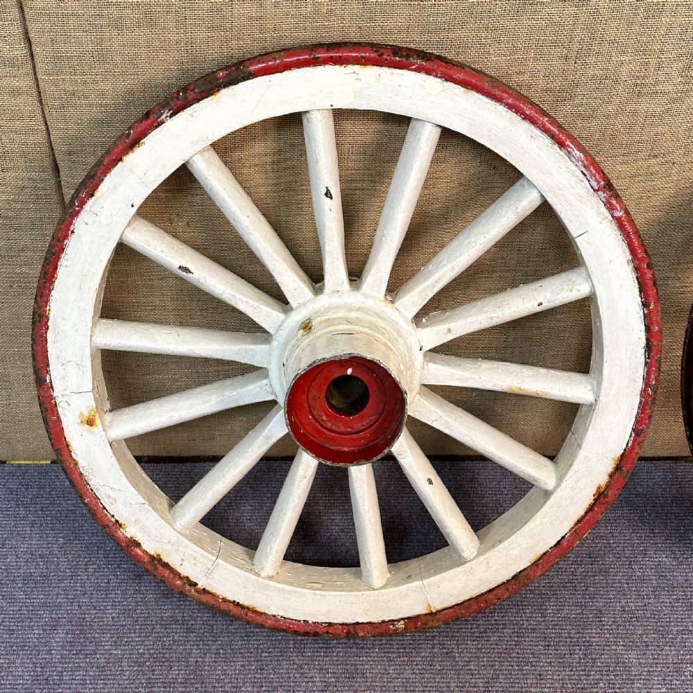 A lovely pair of heavy antique painted cast iron and wood wheels.