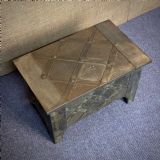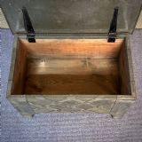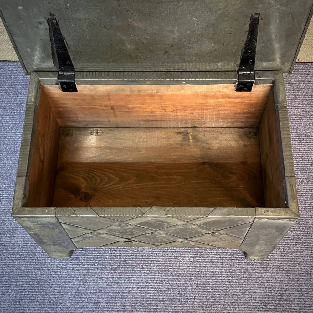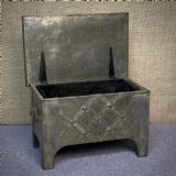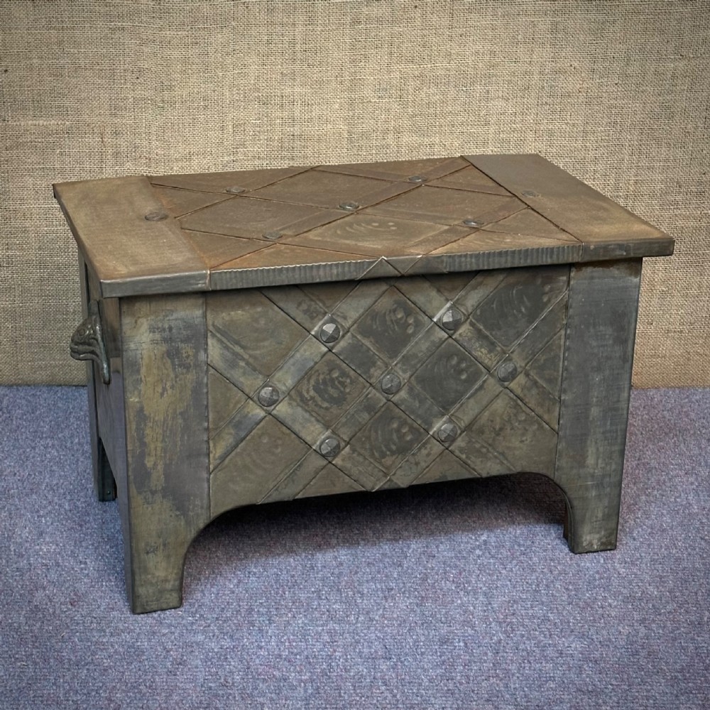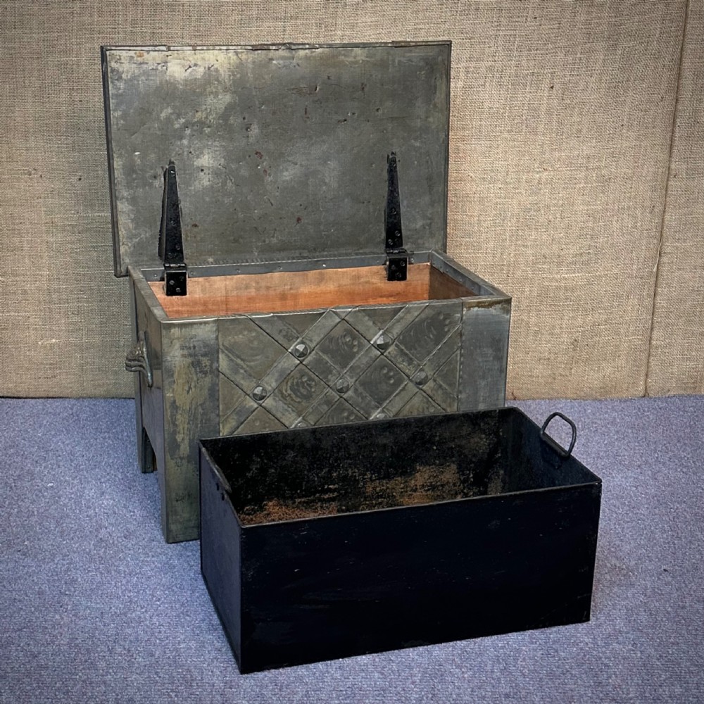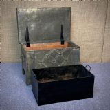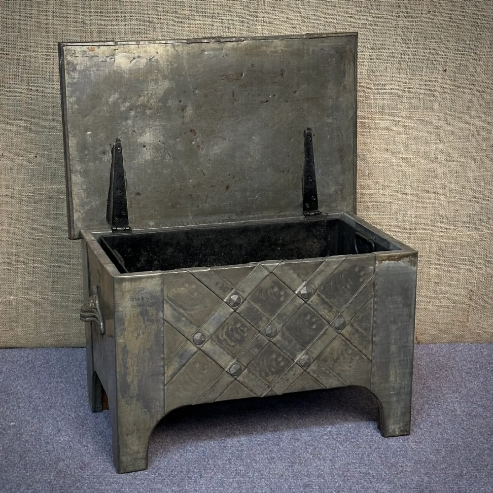 The metal coal box has a hinged lift up top with handles on the side. The box is wooden on the inside and has an internal metal liner which lifts out.