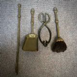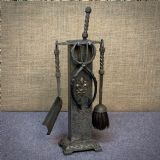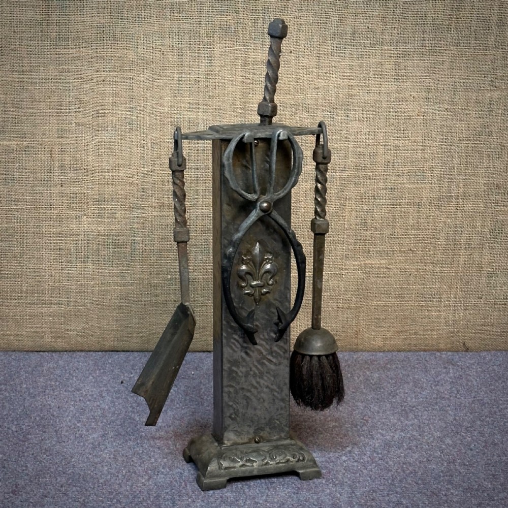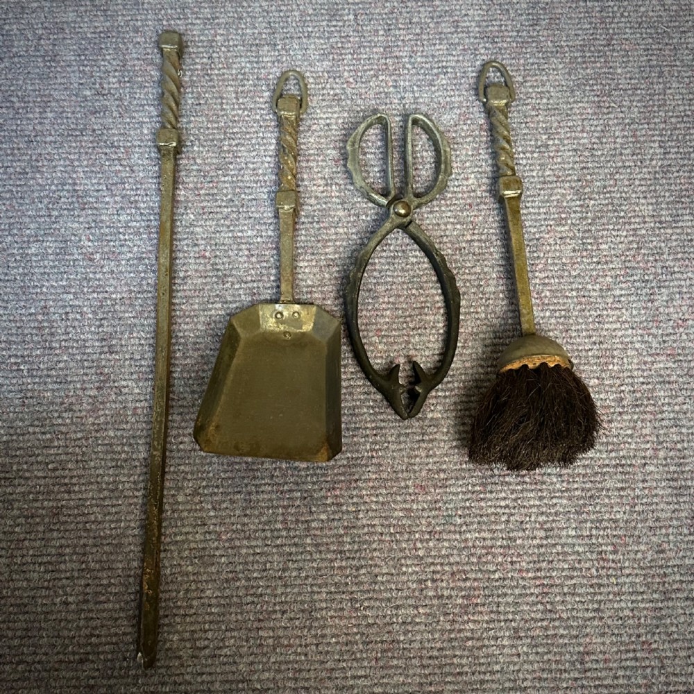 The fireside tools consist of a brush, shovel, tongs and poker on an upright stand.