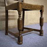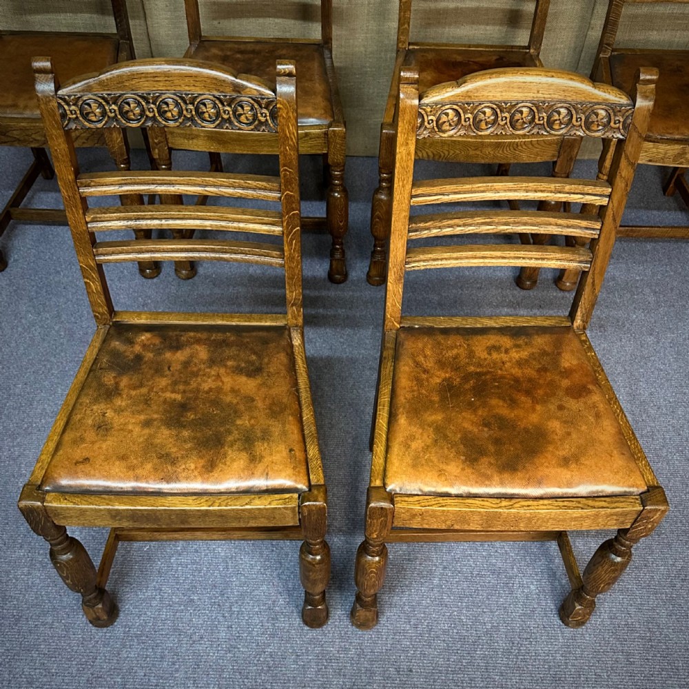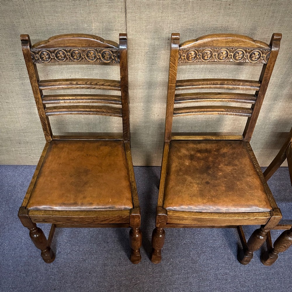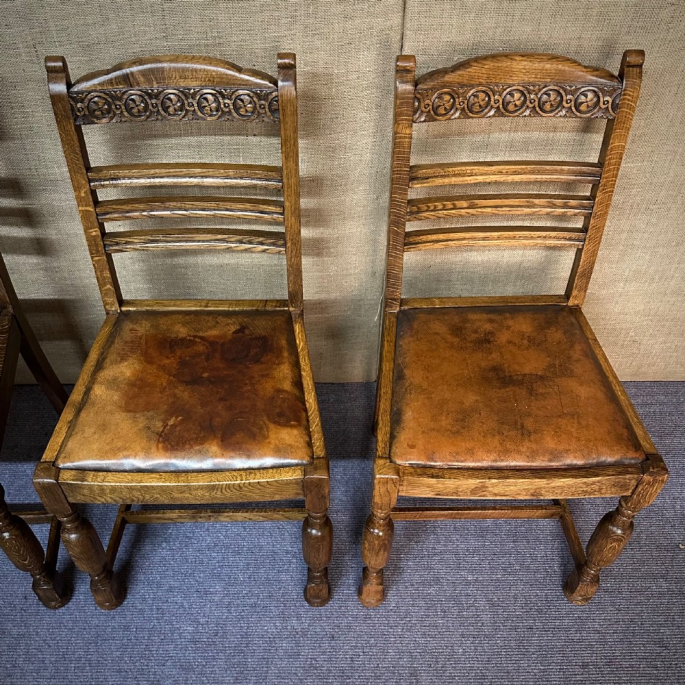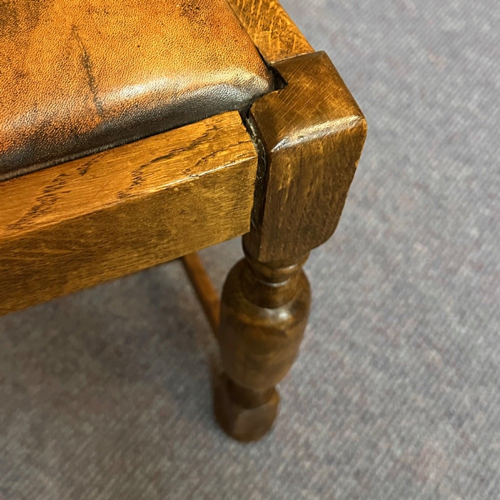 This lovely set of oak and leather dining chairs remains in overall good condition. There are some marks to the leather pads. Although the chairs are solid a couple of the joints have opened up slightly.