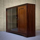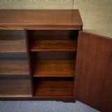 The bookcase has two sliding glass doors with two wooden adjustable shelves. There is a cupboard to the right fitted with a side hinged door with two adjustable sheves.