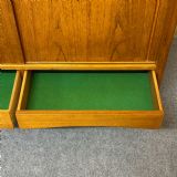 There are two wide drawers beneath the cupboard section which are lined with green baize.