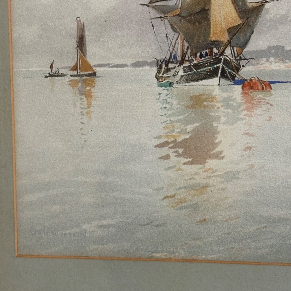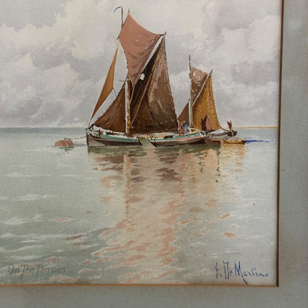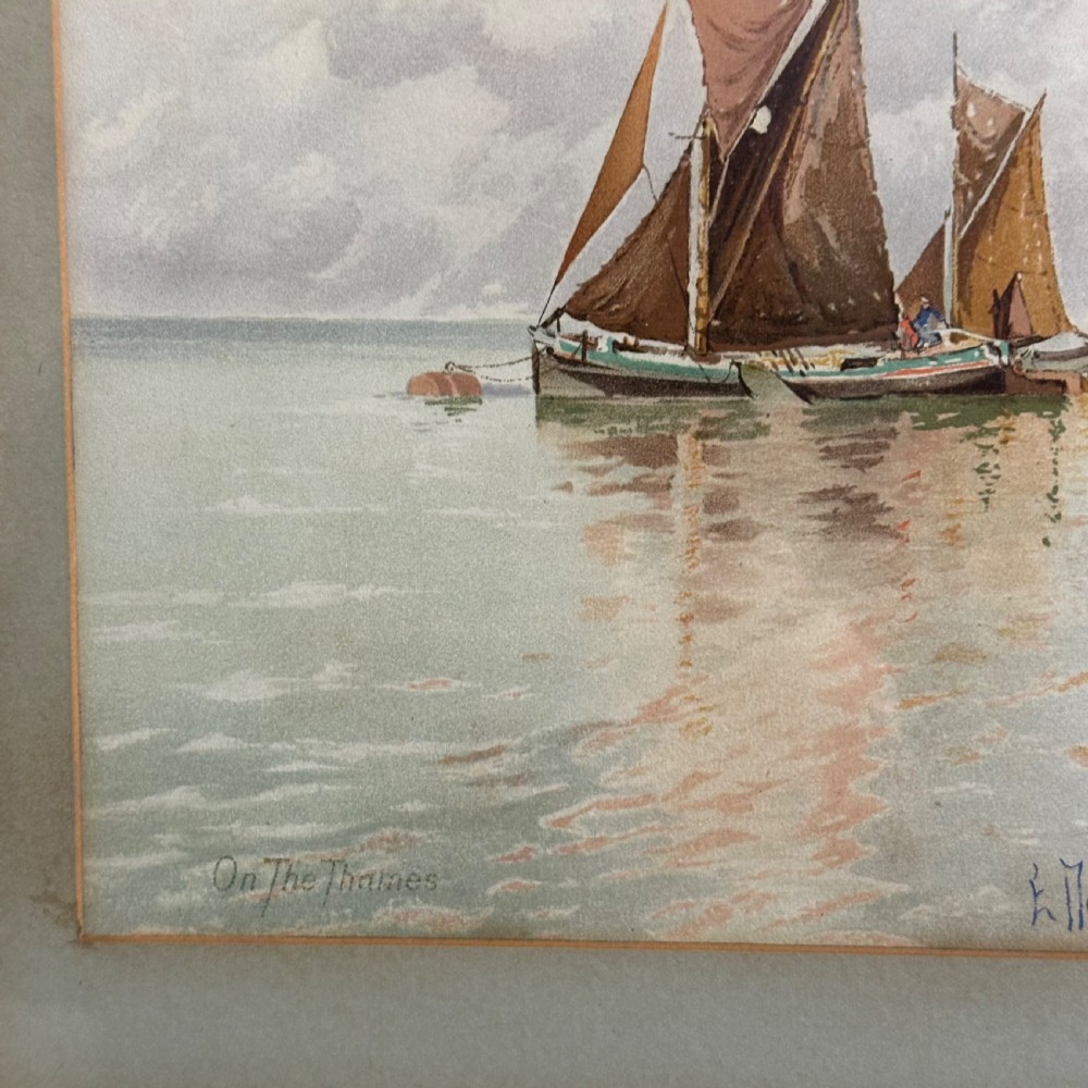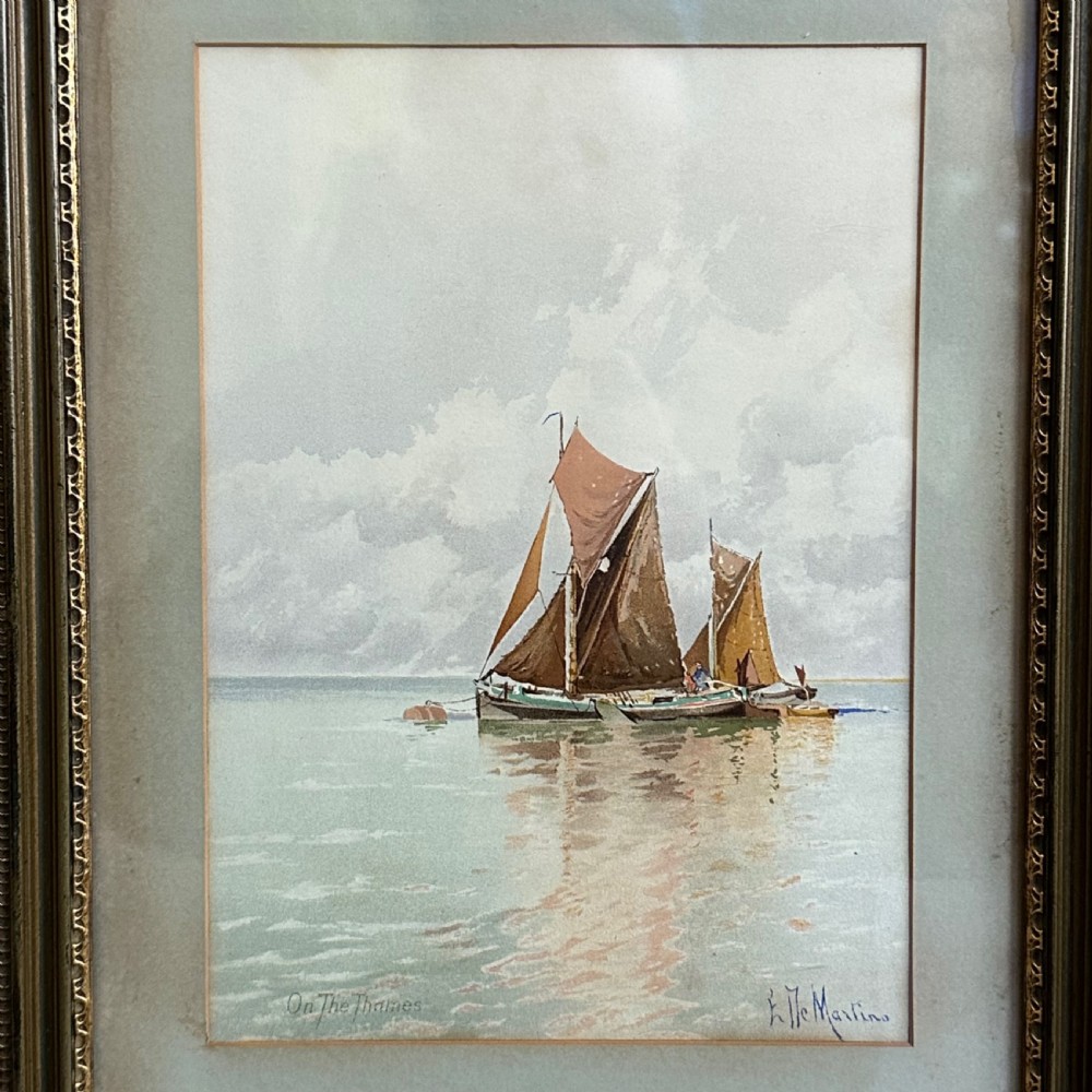 Antique Pair of Elle Martino Framed Prints Depicting Sailing Boats on Thames and Gravesend
