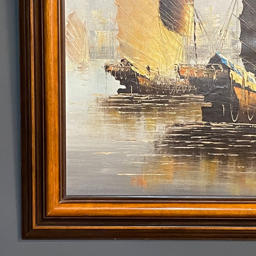 Large Framed Oil Painting of a Hong Kong Harbour Scene With Junk Boats on Canvas